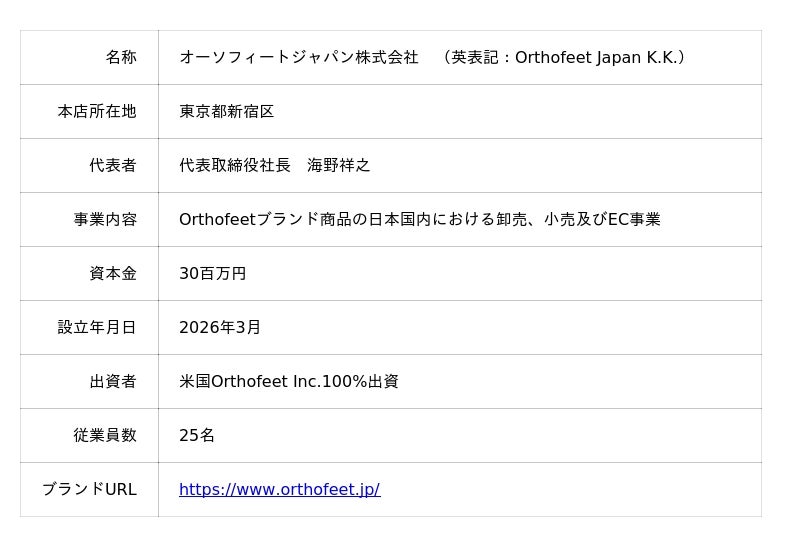 プレミアムハンズフリーシューズを展開する米国Orthofeet(オーソフィート)は、日本現地法人となるオーソフィートジャパン株式会社(英表記Orthofeet Japan K.K.)を設立し、2026年4月1日より活動を開始いたします。Orthofeetは1984年に生体医工学博士号を持つロン・バーと、機械工学修士号を持つマイケル・バーの兄弟により米国で設立され、2024年に日本での製品展開を開始しました。人生で約2億歩(7,000歩×365日x80年)を刻む足、そして歩行を支えるために、バイオメカニクス・足病学に基づいた設計に、米国特許を保有する独自のハンズフリー機能を併せ持ったブランドとして、「少子高齢化」「健康寿命」という社会課題への一助となるよう、 “健康投資”というキーワードを掲げ、現地法人設立によって日本市場へ本格参入します。