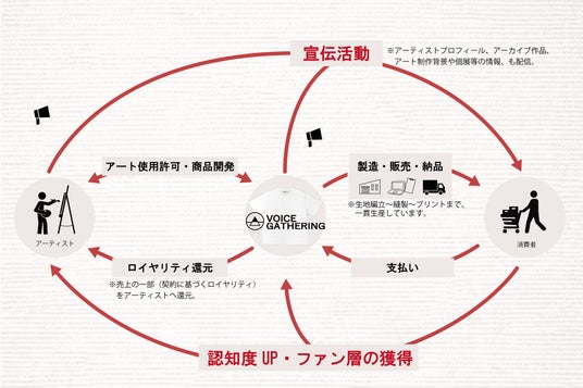 VOICE GATHERINGの発信だけではなく、アーティストと連携し、積極的に情報発信にもご協力頂き、相互でブランド拡大をはかり、継続的に新しいアーティストと協業し、新しい作品を展開しております。コンテンツが蓄積され、ブランドとして成長することで、アーティスト、アートの発信力のサポートになると考えています。