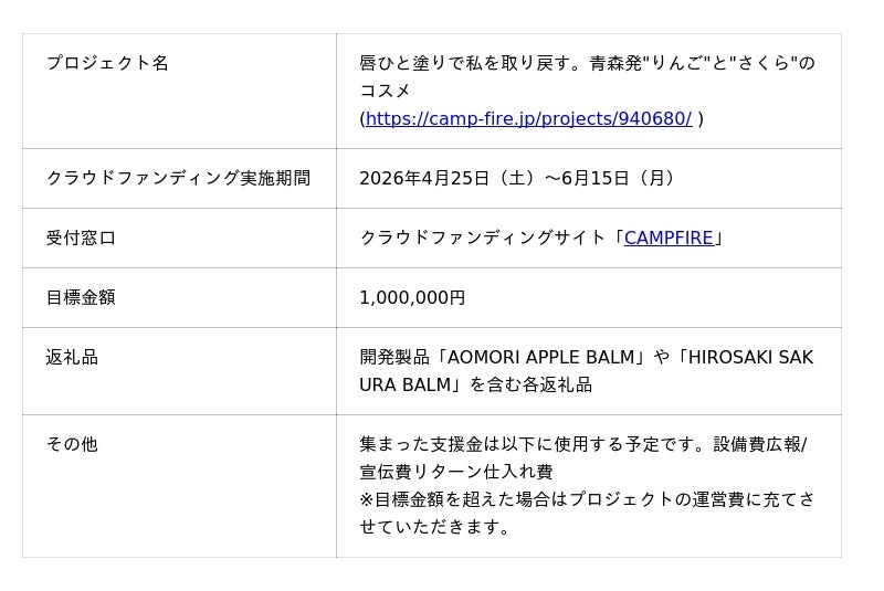 株式会社Lips Lady(本社:青森県弘前市、代表:北山 陽子)は、青森県を代表する素材である「リンゴ」と「さくら」を原材料とした、サステナブルかつジェンダーレスな「APPLE BALM」及び「SAKURA BALM」の製品化を目指し、その開発資金をクラウドファンディングサイト「CAMPFIRE」にて募集を開始します。募集期間は2026年4月25日(土)から6月15日(月)で、募集金額は100万円を目指します。