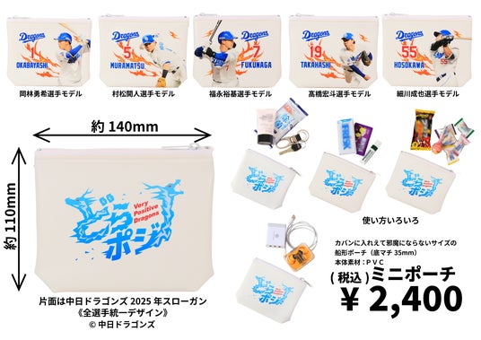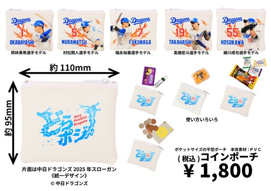第1弾は岡林勇希選手、村松開人選手、福永裕基選手、高橋宏斗選手、細川成也選手の5選手をデザイン。カバンにも入れられるミニポーチとポケットサイズのコインポーチの2種類をラインナップ。