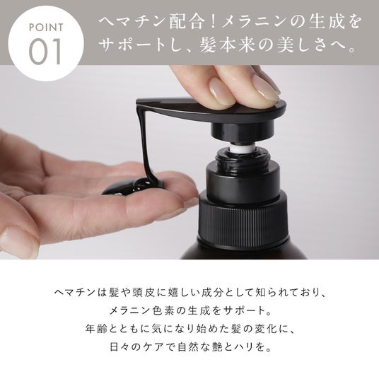 ヘマチン配合!メラニンの生成をサポートし、髪本来の美しさへ。