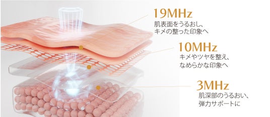 3MHz(深層)、10MHz(中層)、19MHz(表層)の3種類の高密度超音波を搭載。それぞれの周波数を肌に応じて自動切替し、以下のような多角的なスキンケアを実現します。