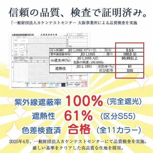 また、紫外線遮蔽率100%、遮光率99.99%以上で晴雨問わず1年中快適にご利用いただけます。