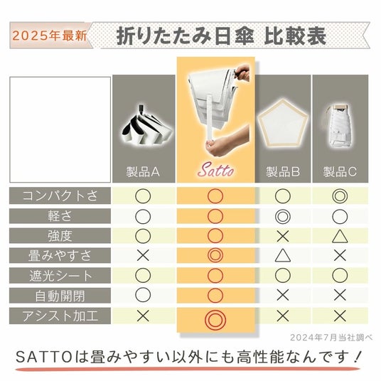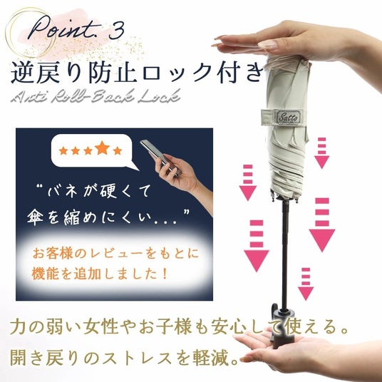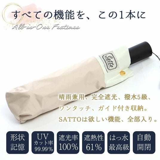 さらに、SATTOはたたみやすさに特化するだけではなく、晴雨問わず1年中快適に使える傘として、たくさんのうれしい機能が備わっています。