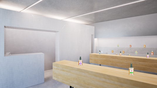 鎌倉の各エリアをイメージしたフレグランスを生かすインテリア。モノトーンな仕上げをベースにモザイクタイルのボリュームとシルバー色に塗装された天井が通りに対してのフックとなる構成とし、中央に配置された杉の柱材や素材感のある左官仕上げが、土地的なフレグランスの受け皿となるような空間デザインです。店舗名 HATAGO KAMAKURA