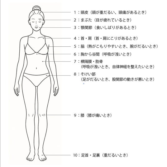 適量を手に取り、気になる部分にやさしくなじませてください。ゆっくりと呼吸をしながら、肌が内側からじんわり温まるような感覚を感じてください。