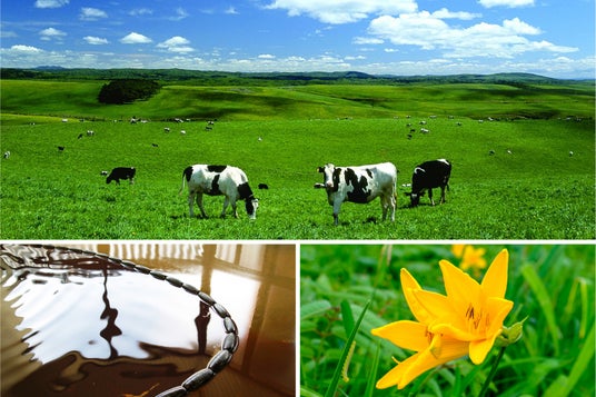 上段:道内でも有数の広大な牧草地 下段左:名湯「豊富温泉」 下段右:黄色が鮮やかな町花「エゾカンゾウ」