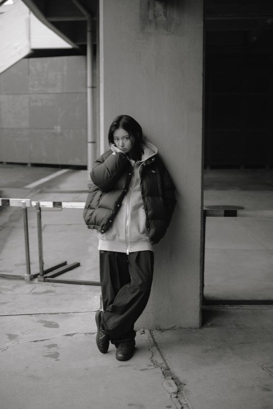 Down jacket¥58,300 10 月販売/Zipup hoodie¥24,200 9 月販売/BARACUTA Wide pants¥39,600 9 月販売/Sneakers Mane1924 ¥22,000 10 月販売