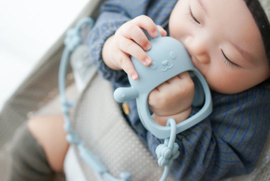 「かみかみウサ」は、Berpy人気シリーズ「かみかみチキン」に続く新作。握りやすくパーツの取れにくい一体型形状で赤ちゃんの手かが外れにくく、外出時はストラップとのセットで使わない場合の落下防止にも対応。