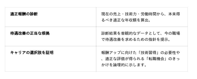 具体的なアクション指針の提示: 診断結果に基づき、「今の職場で賃上げ交渉をすべきか」「さらなる技術習得を目指すべきか」「高単価な環境へ挑戦すべきか」など、次の一手に繋がるモチベーションを喚起します。