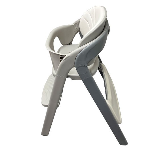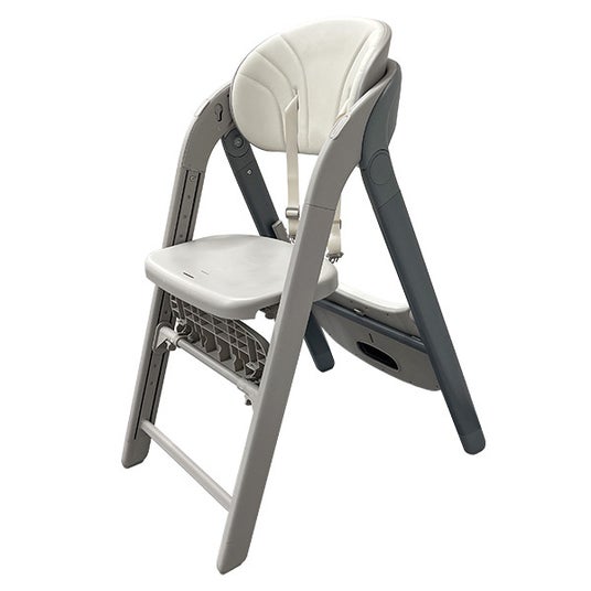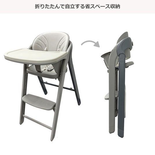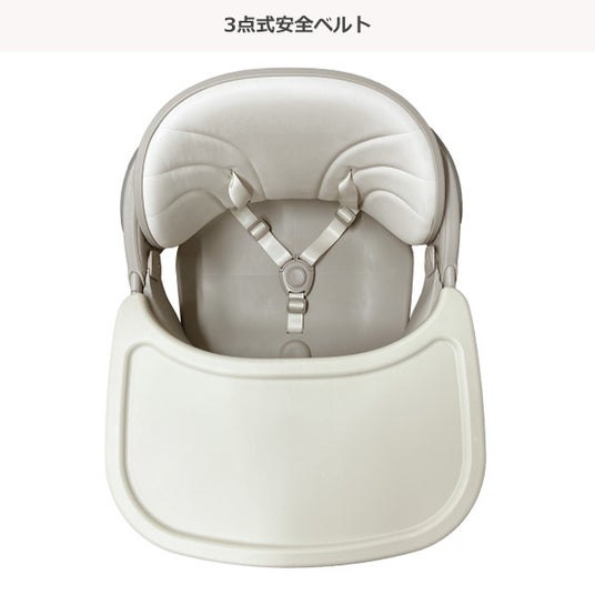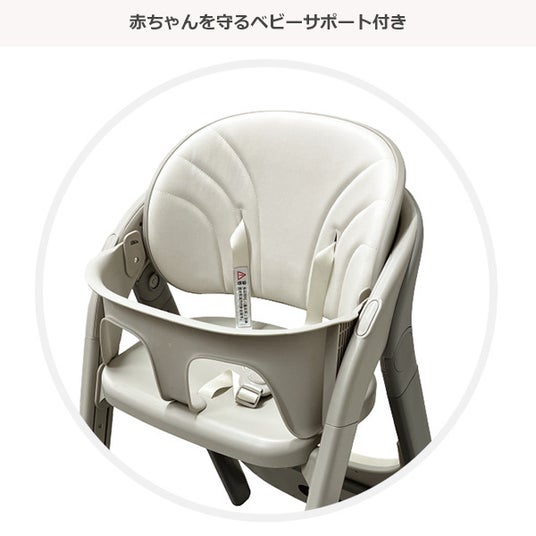 ひとり座りができる生後6ヶ月頃からご使用いただけ、付属のベビーサポートと、3点式のシートベルトで、お子様をしっかりと支えます。付属のテーブルは前後にスライドして位置が調整できるほか、使用しないときは、後脚にスマートに収納できます。