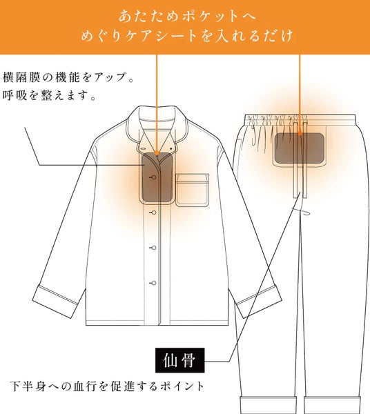これまでにない発想で、衣服の内側に“2か所のあたためポケット”を備えたパジャマです。上着には背中(胸椎付近)を心地よく温めるポケット、ズボンには仙骨まわりを包み込むポケットを配置。どちらも植物性炭素繊維「めぐりケアシート」を入れることで、素材が持つ遠赤外線の温熱効果がふんわりと広がります。