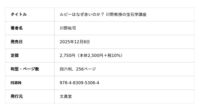 株式会社文眞堂(所在地:東京都新宿区、代表取締役社長:前野 隆)は、英国宝石学協会特別会員(FGA)の資格を持つ大学教授、川野祐司氏による著書『ルビーはなぜ赤いのか? 川野教授の宝石学講座』を、2025年12月8日(月)に発売しました。本書は、宝石の色や輝きの原理、産出の仕組み、鑑別方法までを体系的に解説した本格的な宝石学テキストです。科学的な知識に基づき、宝石業界関係者から愛好家まで、宝石の真の価値を見極めるための知識を提供します。