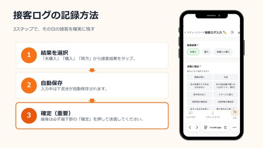 ・入力:スキマ時間に60秒・選択式フォームで接客情報を記録。「買っていただけなかった」情報も入力するのが最大の特徴