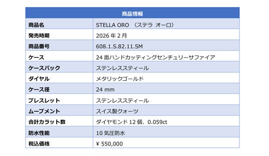 「ステラ オーロ」は、センチュリー独自のサファイアカッティング技術とモダンな実用性が融合したジュエリーウォッチです。フォーマルなシーンを華やかに彩るだけではなく、デイリーな装いをランクアップさせるアイテムとして最適です。