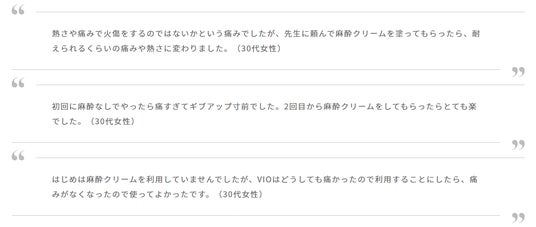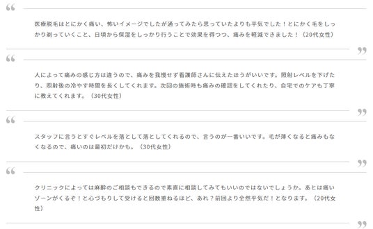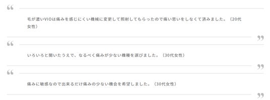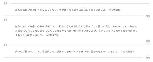 ただし、痛みに配慮して麻酔クリームを使用できるクリニックも増えており、スタッフの声かけや照射ペースの調整で痛みが軽減されたという意見もありました。