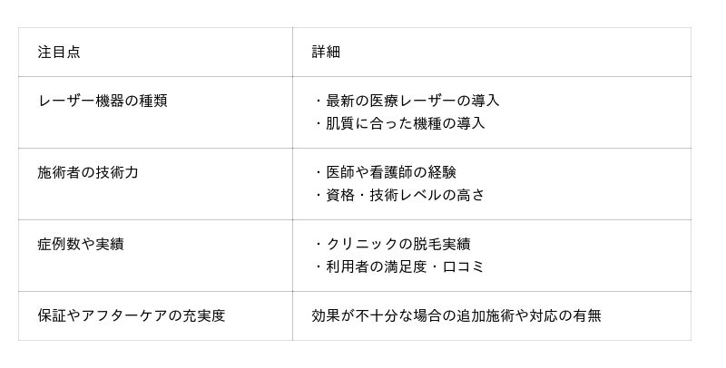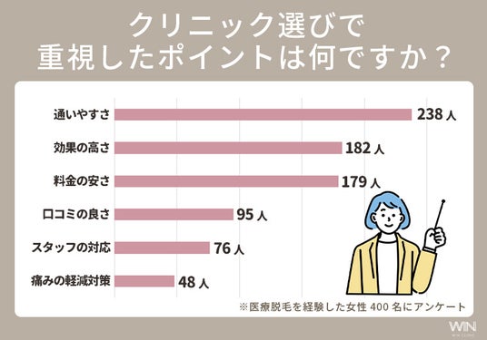 医療脱毛を受けるクリニックを選ぶ際に重視したポイントについて、アンケート調査では以下のような結果となりました。