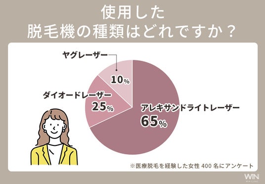 医療脱毛で使用される脱毛機には主に以下の3種類があり、今回の調査ではアレキサンドライトレーザーが65%と最も多く使われていました。