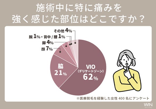 3位にランクインしたのは顔脱毛(特に口周りやあごなど)で、7%が痛みを感じたと回答しました。