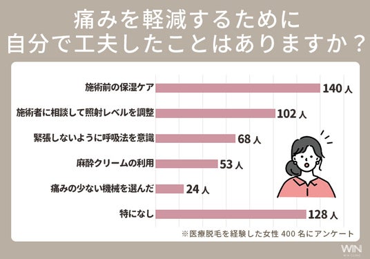 そこで今回は、医療脱毛の経験者400人に対して「痛みを軽減するために自分で工夫したことはありますか?」というアンケートを実施。