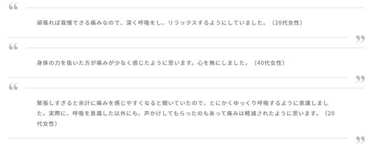 今回のアンケート調査では、痛みに不安を感じた経験者が「安心できた」と答えた要素について具体的な声が集まりました。