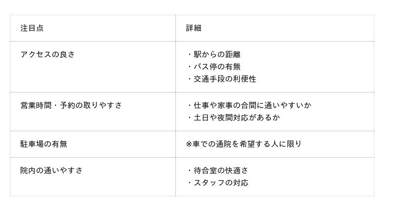 これらを総合的に考え、通いやすさを重視することで、日常生活の中で無理なく通い続けることが可能です。