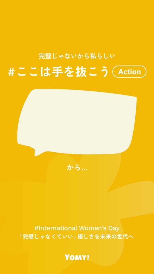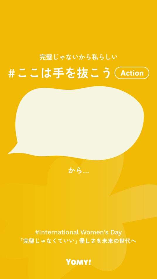 「思いを語ろう、心に翼を広げよう」- 絵本と対話で「伝える力」を育むオンラインスクール「YOMY!」 を運営する 株式会社YOMY(本社:神奈川県横浜市西区、代表取締役CEO:安田莉子) は、国際女性デー(3月8日)に向けたSNSアクション「#ここは手を抜こう」 を2025年3月6日(木)より開始いたします。