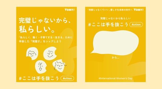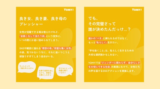 YOMY!では、「私らしく、働く・子育てする・生きる」をテーマに、働く女性や子育て中の母親たち、そしてこの想いに共感する方々とともに「自分らしさを大切にできる」社会の実現にむけて、リアルな声を届けるSNSアクションを実施します。
