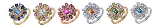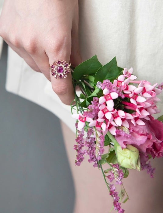花が咲き誇る瞬間を切り取った、立体的なデザインが特徴のアイコニックコレクション『Blooming』。花びら一枚一枚に高低差をつけることで、光を受けたときにまばゆい煌めきを放ちます。中央にはブランドのシンボルであるスクエアカットのカラーストーン。周囲をダイヤモンドが繊細に取り囲みます。まるで指先で花が開き、喜びが広がるような、心まで華やぐリングです。新たに4色が加わり、全6色がラインアップ。