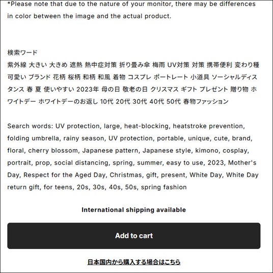 「International shipping available」と表記されている場合、国際配送可能な商品となります。
