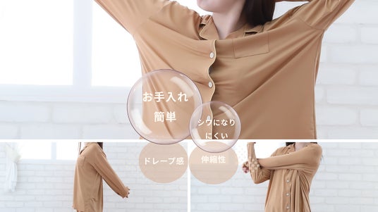 伸縮性とドレープ感を兼ね備えたリラックス設計で、シワになりにくく、自宅で簡単にお手入れが可能です