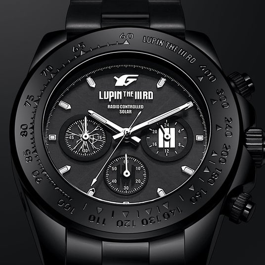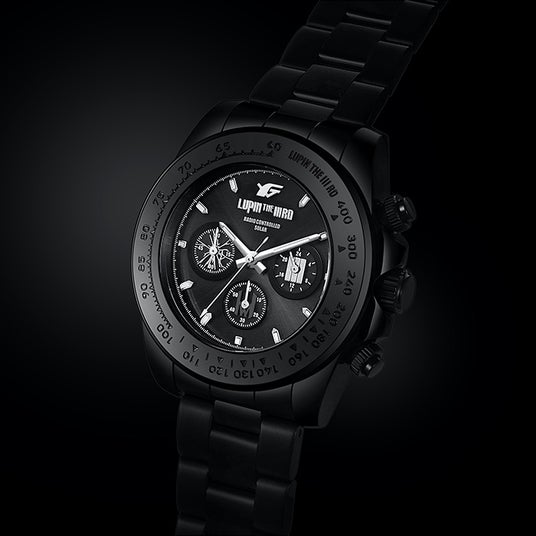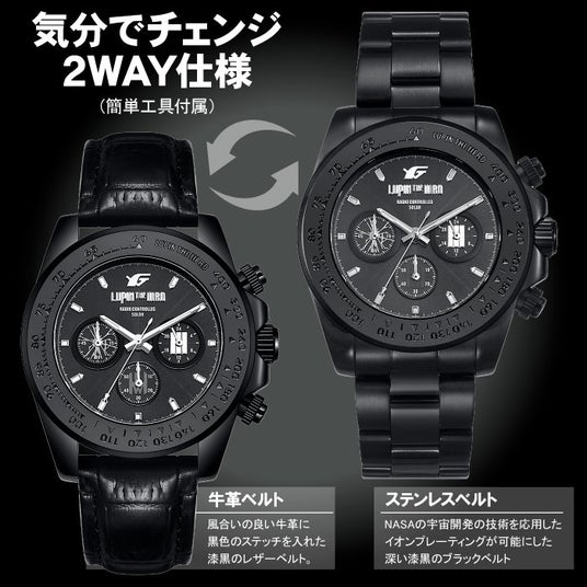 チェンジ用ベルト付き腕時計はルパン三世にとって度々登場する非常に重要なアイコン。1.10万年に1秒の誤差と言われる電波式、2.電池不要のソーラー充電、3.時間を正確に測るストップウォッチ付きのクロノグラフ機構、この『III』の機構が組み合わさったまさにルパンにふさわしくルパンも喉から手が出るほど欲しい腕時計。更にステンレス製ベルトに加え、漆黒の革製チェンジベルトが付属してどんなミッションの時でも自然にこなせる仕様。