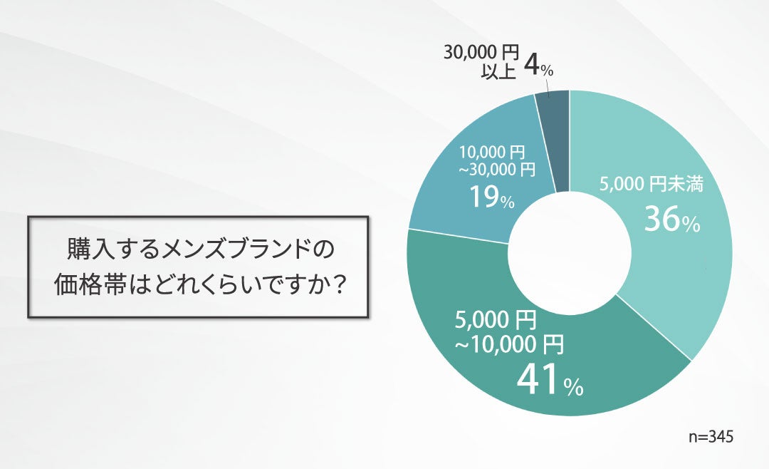 今回の調査で、男性が購入するメンズブランドの価格帯について尋ねたところ、「5,000円~10,000円」が最も多く、全体の41%を占める結果となりました。次いで「~5,000円」が36%と続き、多くの男性が比較的手頃な価格帯のブランドを好んで購入していることが明らかになりました。この結果は、日常使いしやすい価格帯のアイテムが男性の購買意欲を強く刺激していることを示唆しています。一方で、「10,000円~30,000円」も19%と一定の支持を得ており、品質やデザインにこだわりを持つ層も存在することが伺えます。