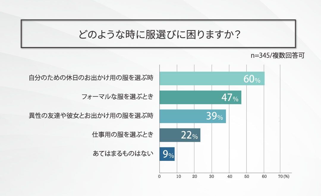 - 服選びに困るシチュエーションは「自分のための休日のお出かけ用の服を選ぶ時」が最多。