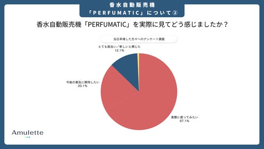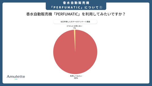 日本初披露となった国際特許取得の香水自動販売機「PERFUMATIC」に関するアンケートでは、来場者の99%が「実際に利用してみたい」と回答。新しい香り体験として、非常に高い関心と期待が寄せられました。