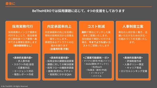 BeTheHEROは、「未来の文化」を創る新卒採用を支援します。採用実務代行から、内定承諾率の向上施策、コスト削減提案、人事制度立案まで、企業の課題に応じたトータルサポートを行っています 。