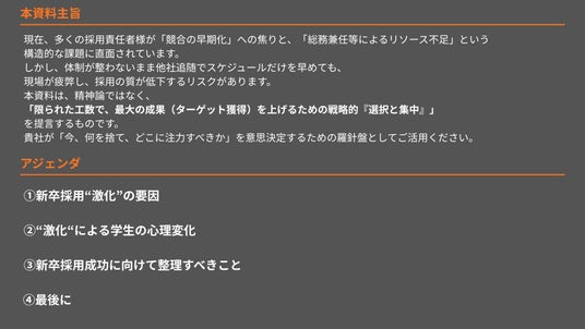 昨今の新卒採用市場は激化の一途をたどっており、「早期化」と「獲得難」が常態化しています 。多くの企業が競合他社への焦りからスケジュールを前倒ししていますが、体制が整わないままの早期化は現場を疲弊させ、採用の質を低下させるリスクがあります 。特に、店舗運営などで多忙を極めるアパレル企業や、総務兼任で採用を行う企業においては、「限られた工数で最大の成果を上げる」ための戦略的な「選択と集中」が不可欠です 。