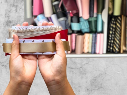 ハギレリボンを組み合わせて作られたリボンポーチ