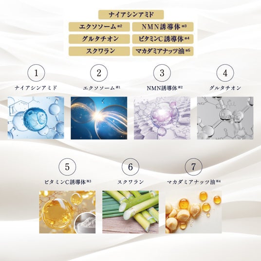 ※1 エイジングケア:年齢に応じたお手入れ ※2 エクソソーム:ヒト脂肪由来間葉系細胞エクソソーム ※3 NMN誘導体:ジヒドロナイア シンアミドリボシドアセチルトリ-t-ブチルトリプトファン※ 4 ビタミンC誘導体:アスコルビルグルコシド ※5 マカダミアナッツ油:マ カデミア種子油 ※6 大豆由来リン脂質:水添レシチン