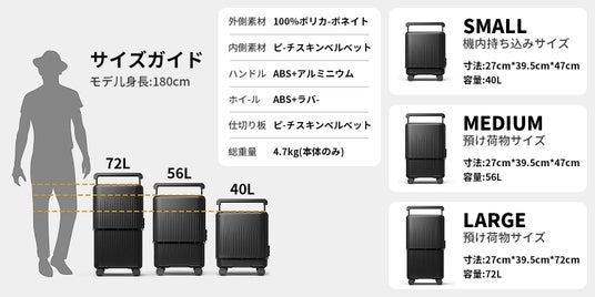 そんな旅行者の悩みを解決するのが、世界初のハードタイプで伸縮可能なスーツケース「VELO」です。 独自の特許技術により、ボタン一つで「機内持ち込みサイズ(40L)」から「預け入れサイズ(72L)」へと、瞬時に変形します。