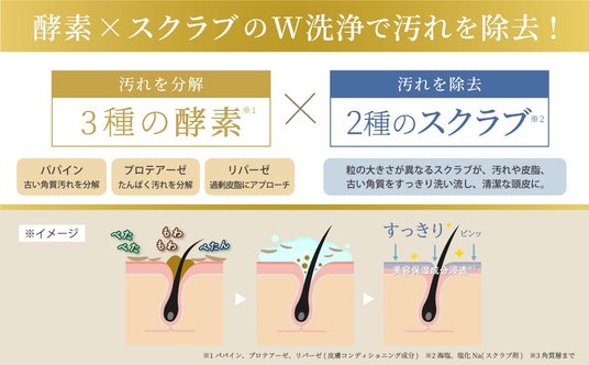 3種の酵素*¹と2種のスクラブ*²が、Wの力で頭皮の蓄積汚れやニオイをスッキリ洗浄。