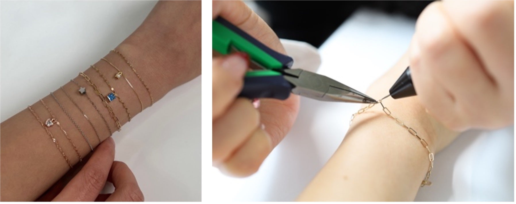 また、専用機材を用いたパーマネントジュエリーを用意し、その場で装着、ご購入が可能となりました。多彩なチェーンやチャームをお客様ご自身で自由にセレクトしてカスタムができる展示もご用意しております。さらに、フォトスポットで思い出を残していただいたり、カプセルトイで期間中に使用できる割引券又はLink2Meのアイテムを持ち帰っていただけたり、空間そのものが皆様の特別な体験となるよう願っております。