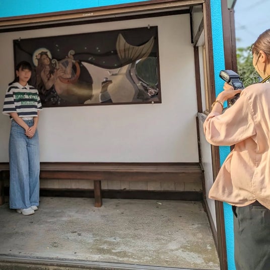 観光客や地元の人もよく使うバス待合所であることから、売上の全部とメンバーの自腹を使い内装から綺麗にリフォームしました。さらに田舎ではバスの本数も少ないため、待合所にいる時間も長くなります。そんな時でも楽しめるように、太宰治の生まれた金木町で活動しているアーティストの山本風花さんに特大の絵画を描いて頂き、待合所内に一定期間展示しました。またこの絵の染料には青森市浪岡にある「あおもり藍工房」の藍をふんだんに使用してもらい、津軽海峡の深い海を表現して頂きました。