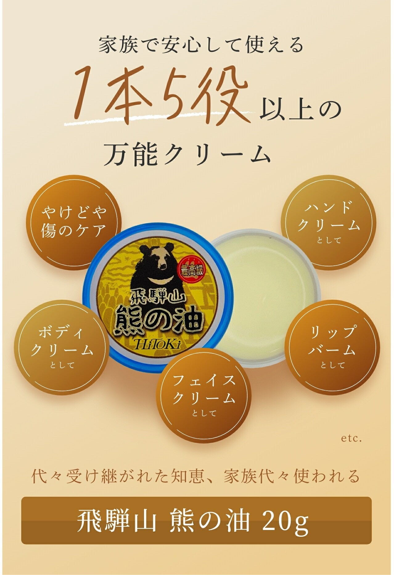 奥飛騨産「月の輪熊」の油を使用した天然保湿バーム。無香料・無着色で肌なじみが良く、乾燥ケアや唇・手荒れ対策、アウトドアやスポーツ時の保護など幅広くお使いいただけます。