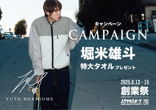 1973年6月に設立した株式会社ムラサキスポーツは、創業祭特別企画として、2025年6月13日(金)~6月15日(日)の3日間限定で、世界的スケーターでムラサキスポーツ契約ライダーの堀米 雄斗とコラボレーションキャンペーンを展開いたします。
