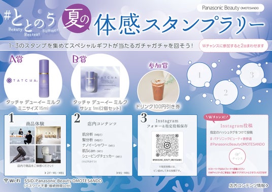 MB1フロアにて、アメリカ発発酵スキンケアブランド「タッチャ」のスキンケアをお試しいただけます!さらに、パナソニックビューティ表参道店内のコンテンツを体感しスタンプを集めると、7月23日に発売したばかりの「タッチャ デューイ― ミルク」(ミニサイズ・サシェ)があたるガチャガチャにご参加いただけます。