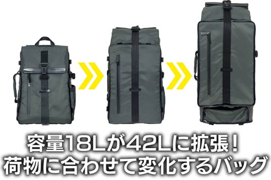 トランスフォームするリュック バッグ。【FLEXY】は18LのDバッグが最大でなんと42Lのバックパックに変身!何と230%も拡張します。