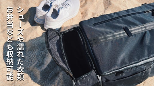 多目的ボトムポケット →使用後のシューズやウェアなど、汚れが気になるアイテムも安心。他の荷物と分けて収納でき、バッグの中を清潔に保てる設計です。普段はカメラやお弁当の収納にも!