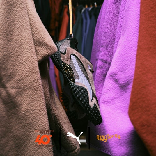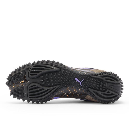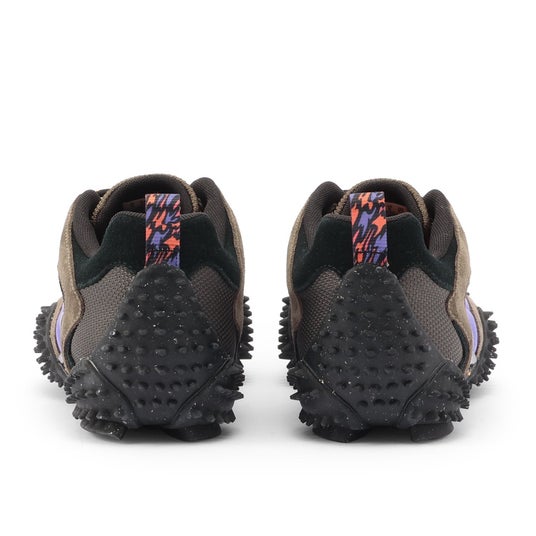 PUMAの「Mostro(モストロ)」は、1999年に登場したブランドの中でも特異な存在感を放つアイコンモデル。その名前の由来はイタリア語で“モンスター”を意味し、まさにその名の通り、異形で実験的なデザインが大きな話題を呼びました。このモデルは、1960年代のスプリント用スパイクと1980年代のサーフシューズという、相反する2つのスポーツシューズの要素を掛け合わせて誕生したハイブリッドデザイン。ロー・プロファイルなシルエットに、スパイクのような突起を配したアウトソールが特徴的で、スポーツとストリート、さらにはファッションを横断するユニークなスタイルを確立しています。その派生モデルである「Mostro XC」は、オリジナルの意匠を継承しつつ、よりアウトドアやトレイルの要素を取り入れた構造を採用。スエード、テキスタイル、合成皮革などを組み合わせたアッパーと、耐久性の高いラバー+TPUのソール構成で、実用性とデザイン性を兼ね備えています。
