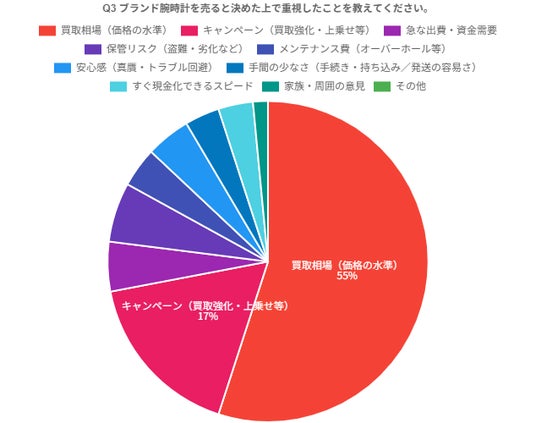 - 売却を決めた上で重視したことは「買取相場(価格の水準)」(55%)が突出。次いで「キャンペーン(買取強化・上乗せ等)」(17%)。